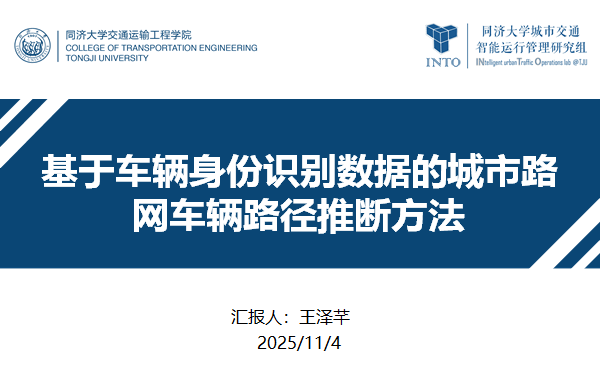 高正勇同学对近期关于“车辆路径与信号在途协同优化”的相关开展汇报。汇报主要围绕两个方面“近期工作”和“研究进展”展开。“近期工作”主要介绍了研究背景、方法,梳理了现有的研究基础,研究框架和研究算法。在此基础上,提出了信号控制和路径规划分别的改进措施。“研究进展”主要汇报了当前在信号控制部分的进展--在现有背压控制的基础考虑NCV的流向估计问题了。交流环节中,唐克双老师、朱宏老师及组内成员提出针对性建议,并明确下一阶段重点任务:明确检测器的布点问题以及尝试更高级的NCV流向估计方法。