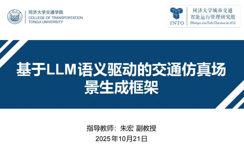 汇报内容分为五个部分:第一部分阐述了引言,明确了研究背景、意义与创新点,指出在传统场景生成方法中提升自动化程度与语义一致性的必要性。第二部分聚焦于相关研究进展,系统总结了基于规则、数据驱动及深度生成模型的主流场景生成技术,分析其在语义建模与执行可靠性上的局限。第二部分聚焦于相关工作,系统总结了基于规则、数据驱动及深度生成模型的主流场景生成技术,分析其在语义建模与执行可靠性上的局限;第三部分介绍了所提出的语义驱动场景生成框架的方法论,利用大型语言模型实现从自然语言到结构化仿真配置的自动映射。第四部分展示了实验结果,表明所提方法在生成效率与执行成功率方面显著优于基线方法;在保持较低计算成本的同时,仍能生成较为合理的可执行仿真场景。第五部分讨论了未来工作方向,包括进一步增强领域知识约束、优化RAG知识管理机制,以及扩展框架至多模式交通仿真与智能决策支持问题。