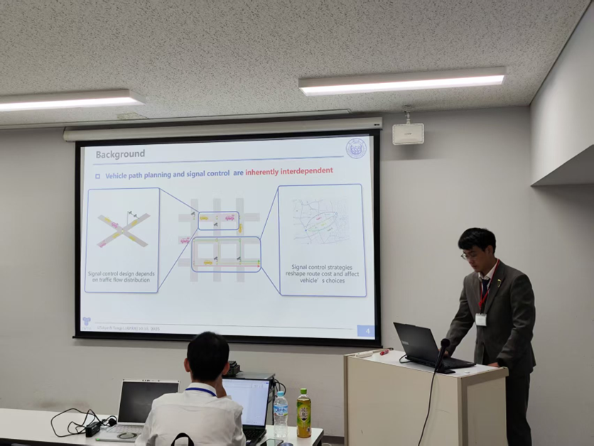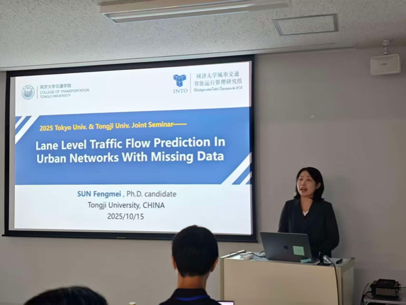 在学生与青年教师报告环节,孙凤美作“Lane Level Traffic Flow Prediction in Urban Networks with Missing Data”报告,介绍了在城市信控路网中面向多进口道、多车道、多相位的细粒度交通流预测方法,尤其是在检测信息存在缺失的情况下,如何通过多源融合建模与时空图结构学习提升车道层级流量预测的稳定性和可靠性。
